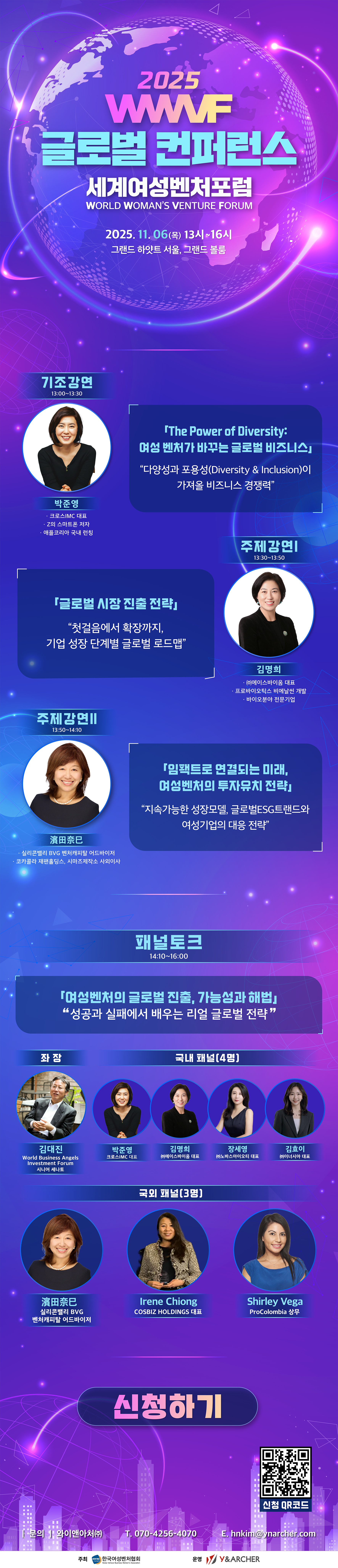 ¿À´Â 11¿ù 6ÀÏ(¸ñ) ¿ÀÈÄ 1½ÃºÎÅÍ 4½Ã±îÁö, ¼¿ï Çѳ²µ¿ ±×·£µå ÇÏ¾æÆ® È£ÅÚ ±×·£µåº¼·ë¿¡¼ Àü ¼¼°è ¿©¼º â¾÷ÀÚ¿Í º¥Ã³ ´ëÇ¥µéÀÌ ÇÑÀÚ¸®¿¡ ¸ðÀÌ´Â ¡¸2025 ¼¼°è¿©¼ºº¥Ã³Æ÷·³ ±Û·Î¹ú ÄÁÆÛ·±½º(World Woman’s Venture Forum, WWVF)¡¹°¡ °³ÃֵȴÙ.